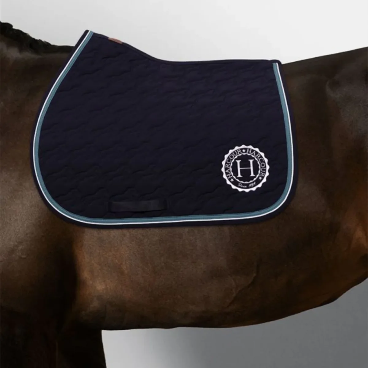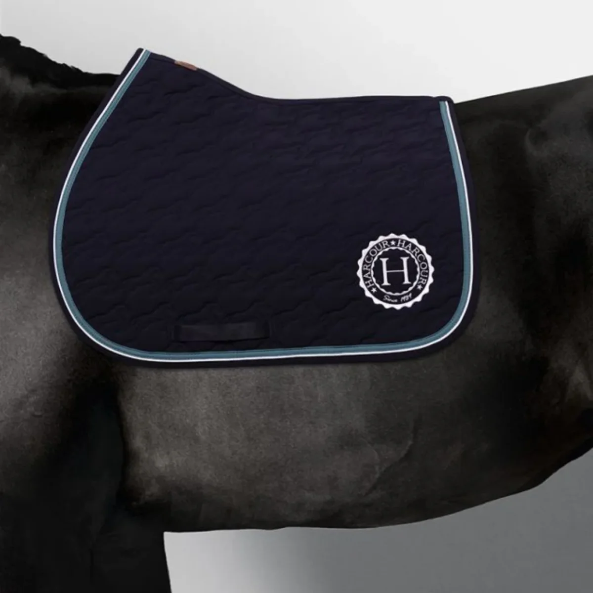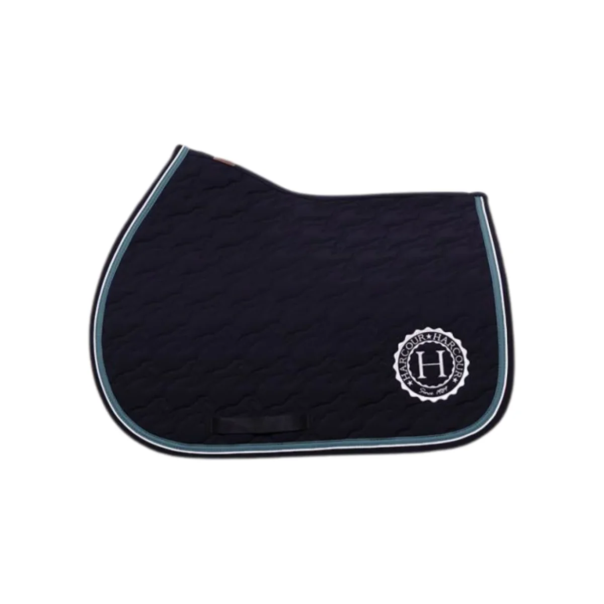 Sottosella da salto con interno in cotone goffrato e con striscia decorativa e bordino a contrasto lungo il bordo. Trapuntatura con motivo a cavallo e logo Harcour sul lato sinistro. Toppa in similpelle Harcour all’altezza del garrese.