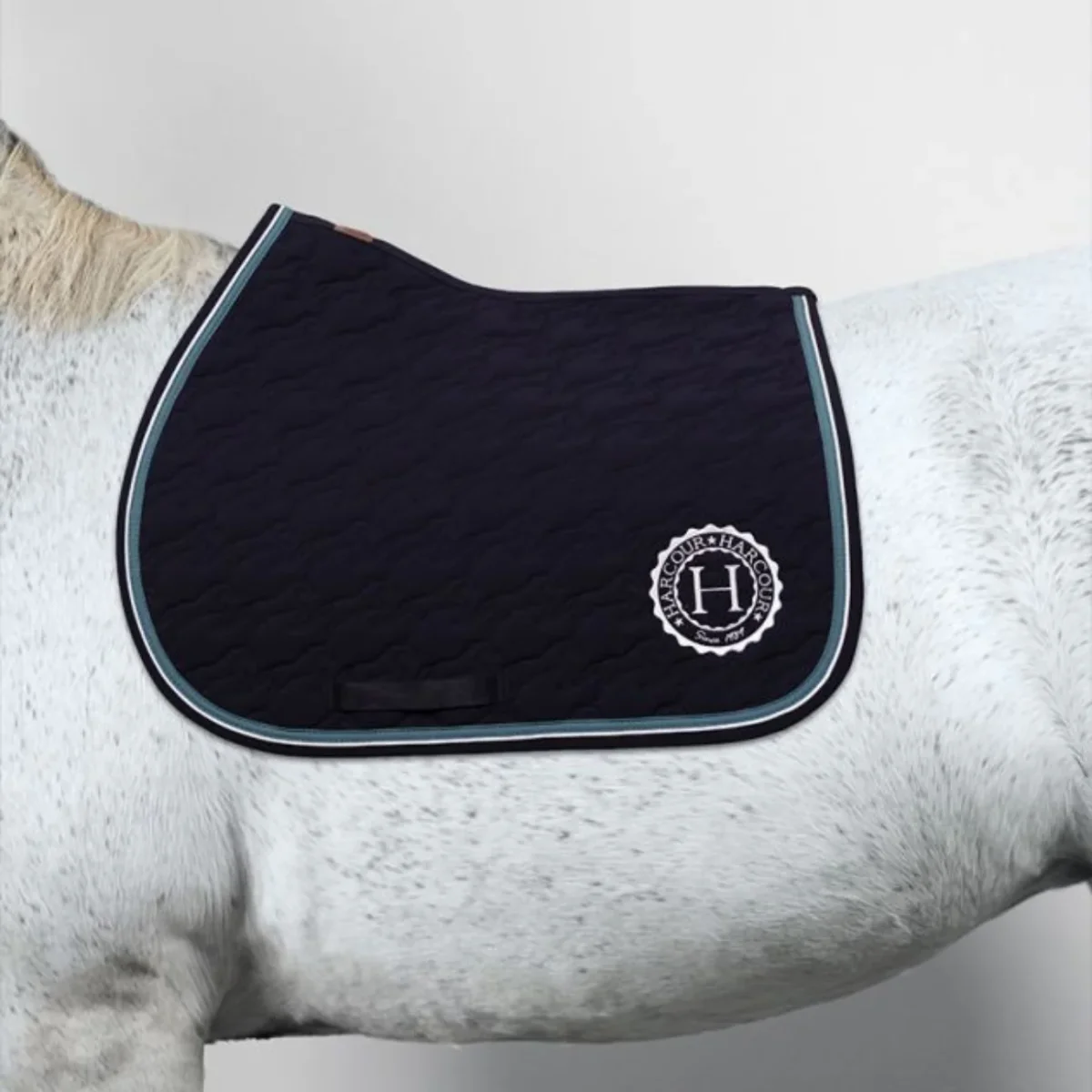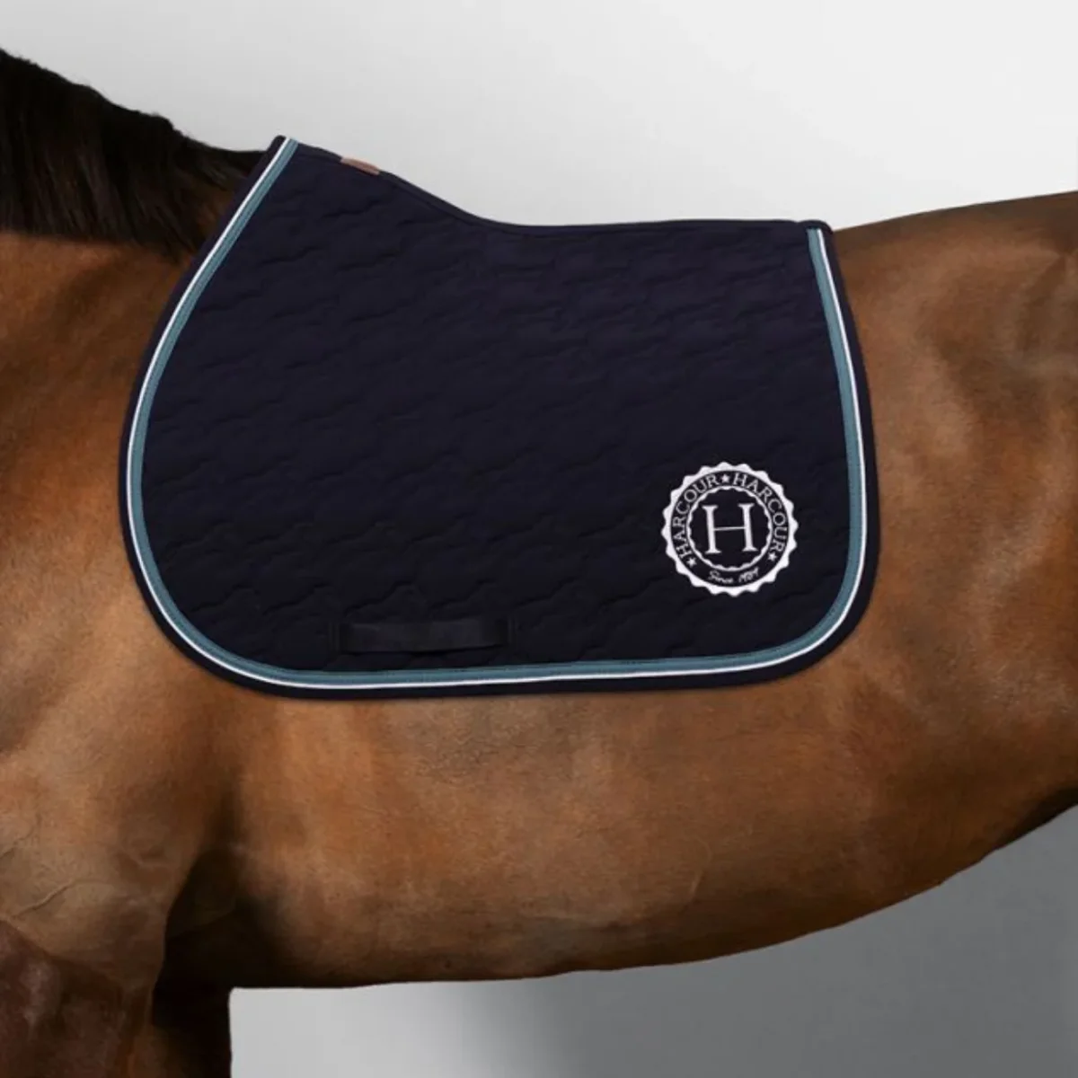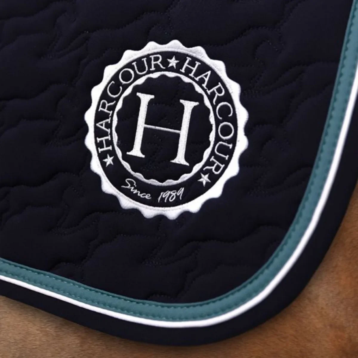 Sottosella da salto con interno in cotone goffrato e con striscia decorativa e bordino a contrasto lungo il bordo. Trapuntatura con motivo a cavallo e logo Harcour sul lato sinistro. Toppa in similpelle Harcour all’altezza del garrese.