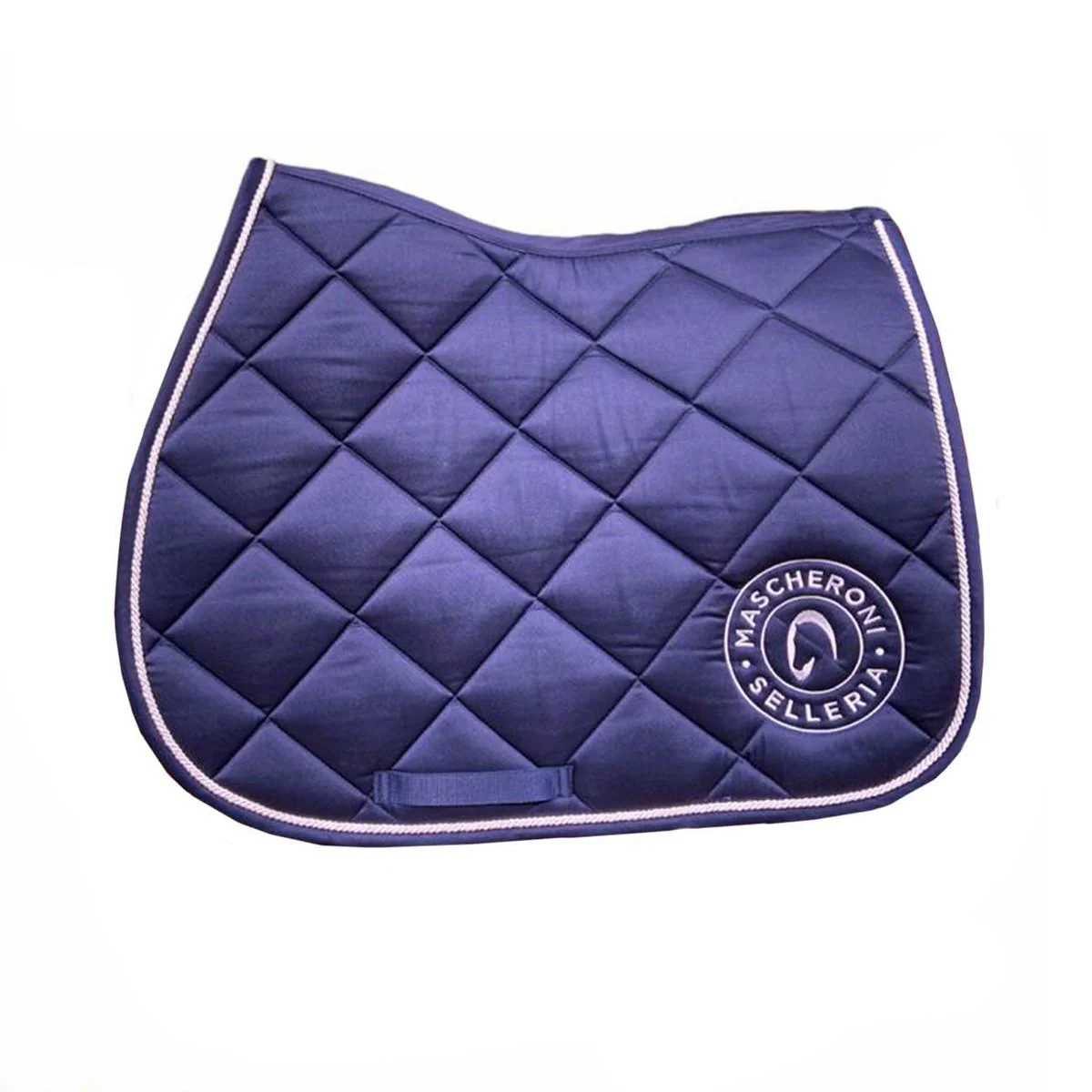 Sottosella da salto in elegante tonalità blu navy, impreziosito dal logo tondo Mascheroni Selleria ricamato in bianco. Realizzato in 100% cotone italiano esterno e 100% cotone nido d’ape italiano interno. La trapuntatura a rombi garantisce comfort e funzionalità ; distribuendo in modo uniforme la pressione.