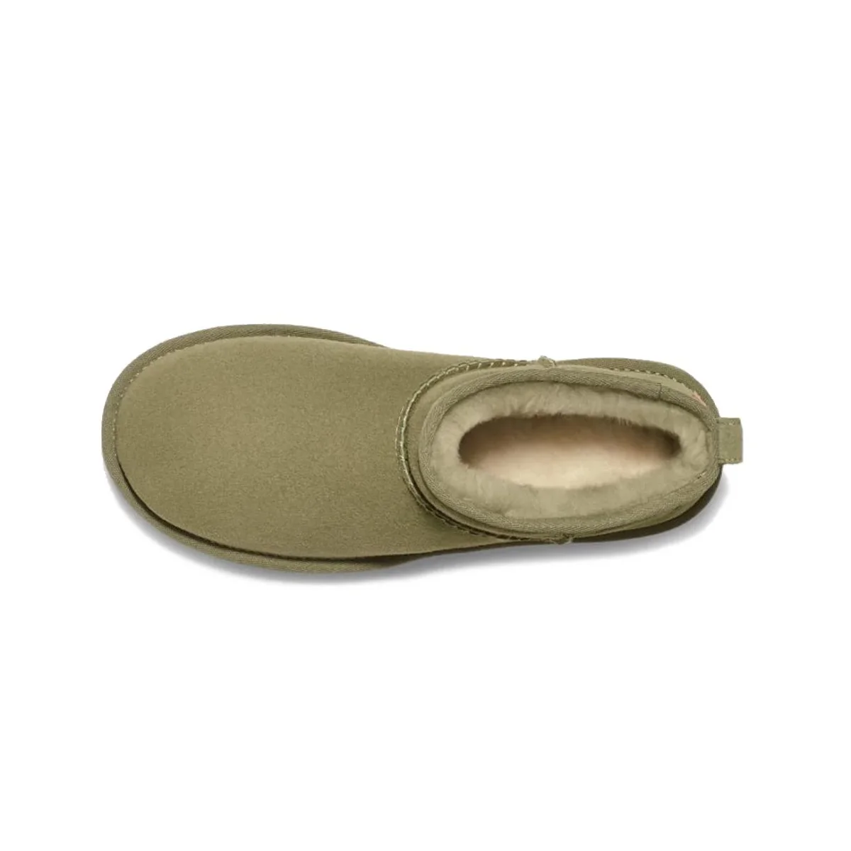 Stivaletti – Modello: CLASSIC ULTRA MINI – Colore: SHADED CLOVER Stivaletto basso alla caviglia realizzato in montone. Presenta tomaia in camoscio, punta arrotondata e cuciture a vista, logo applicato sul retro e suola in gomma leggera. L’articolo perfetto per rendere fashion tutti gli outfit!