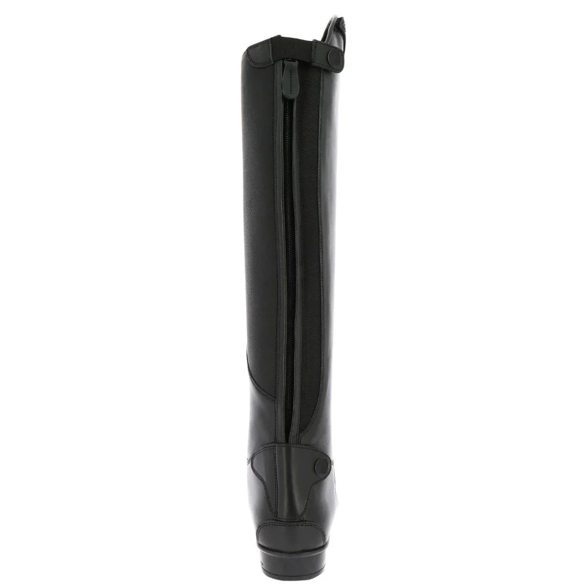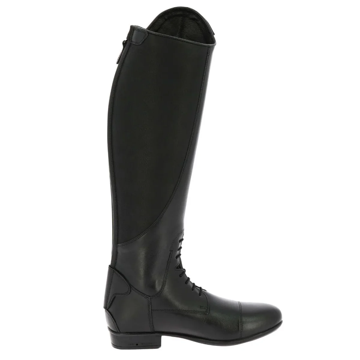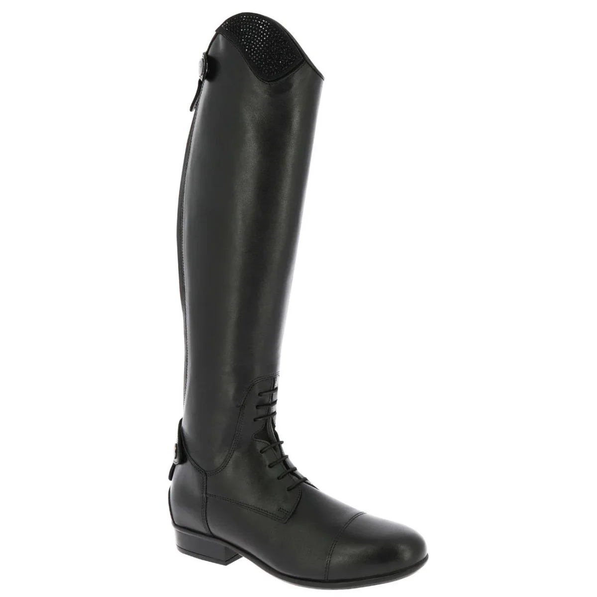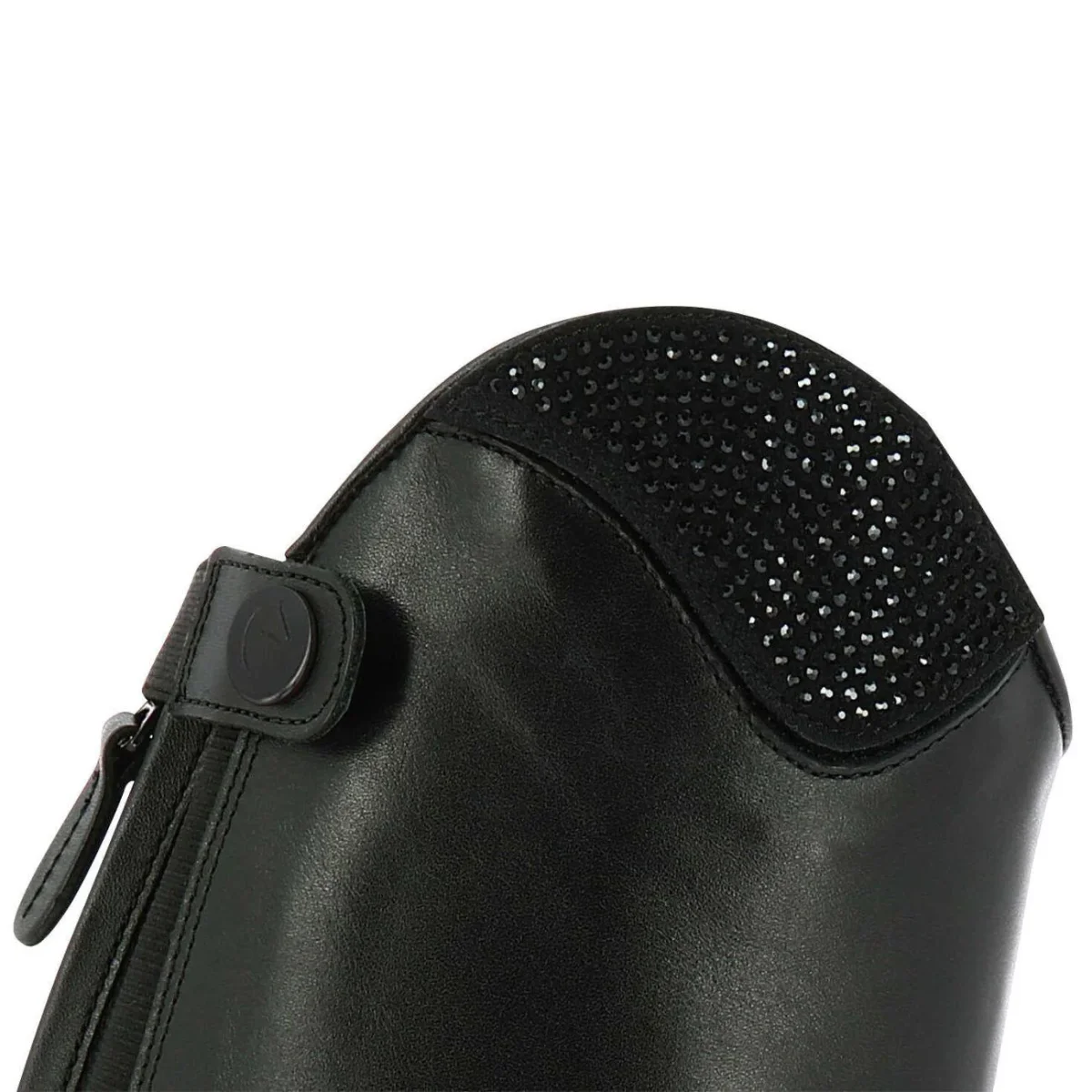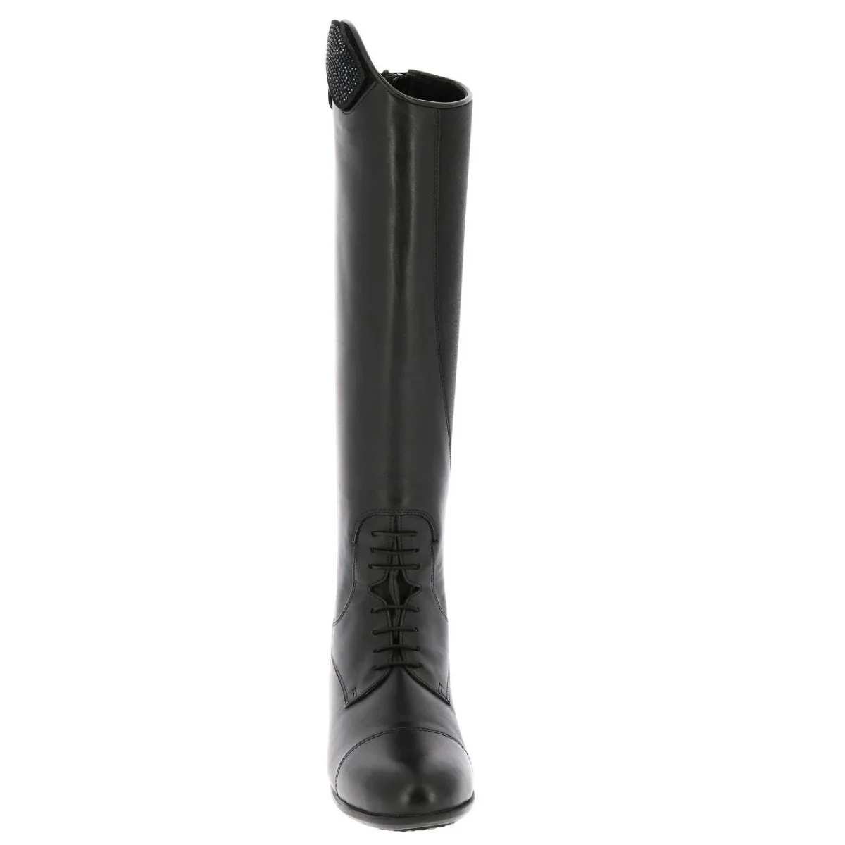 Stivali in pelle pieno fiore morbida e liscia con una toppa a strappo con strass neri e cerniera YKK posteriore montata su elastico, fissata in alto e in basso con una patta in pelle e bottone automatico. Soletta interna estraibile in morbido poliuretano con zone di distribuzione della pressione e inserto in gel ammortizzante sul tallone, arco plantare preformato per un migliore supporto e comfort e suola in gomma antiscivolo con una zona comfort in morbido poliuretano con punte, dotata di ventilazione “Air System” ed effetto airbag ammortizzante. Fodera del piede assorbente e traspirante in nylon/schiuma. Lacci elastici nella parte anteriore e cuciture tono su tono sulla punta.