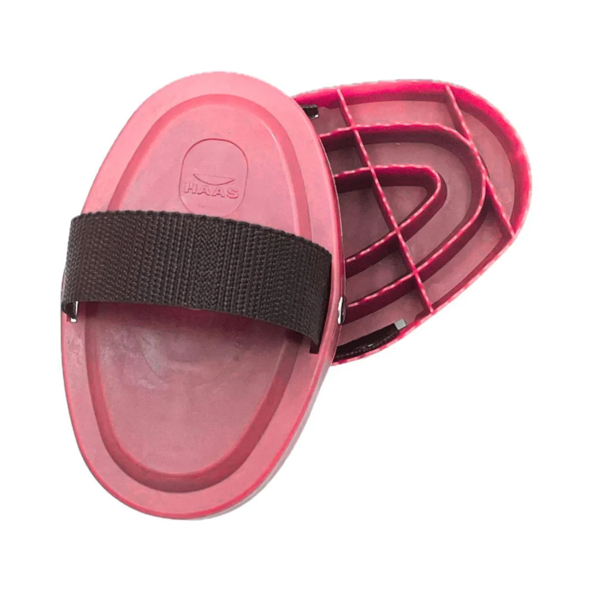 Pratica striglia per la pulizia quotidiana del cavallo realizzata in un morbido materiale sintetico a base di gomma naturale.