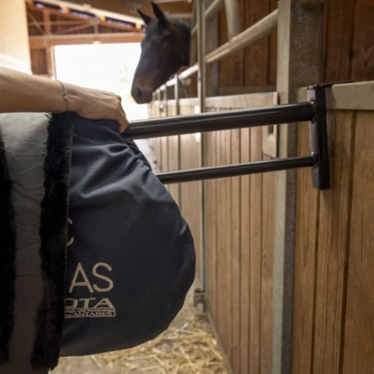 Portasella pratico e robusto, da appendere alla porta del box, ideale per riporre sella e sottosella. La struttura assicura stabilità e resistenza, mentre l’aggancio superiore permette un fissaggio rapido e sicuro.