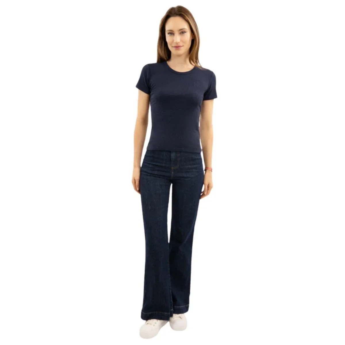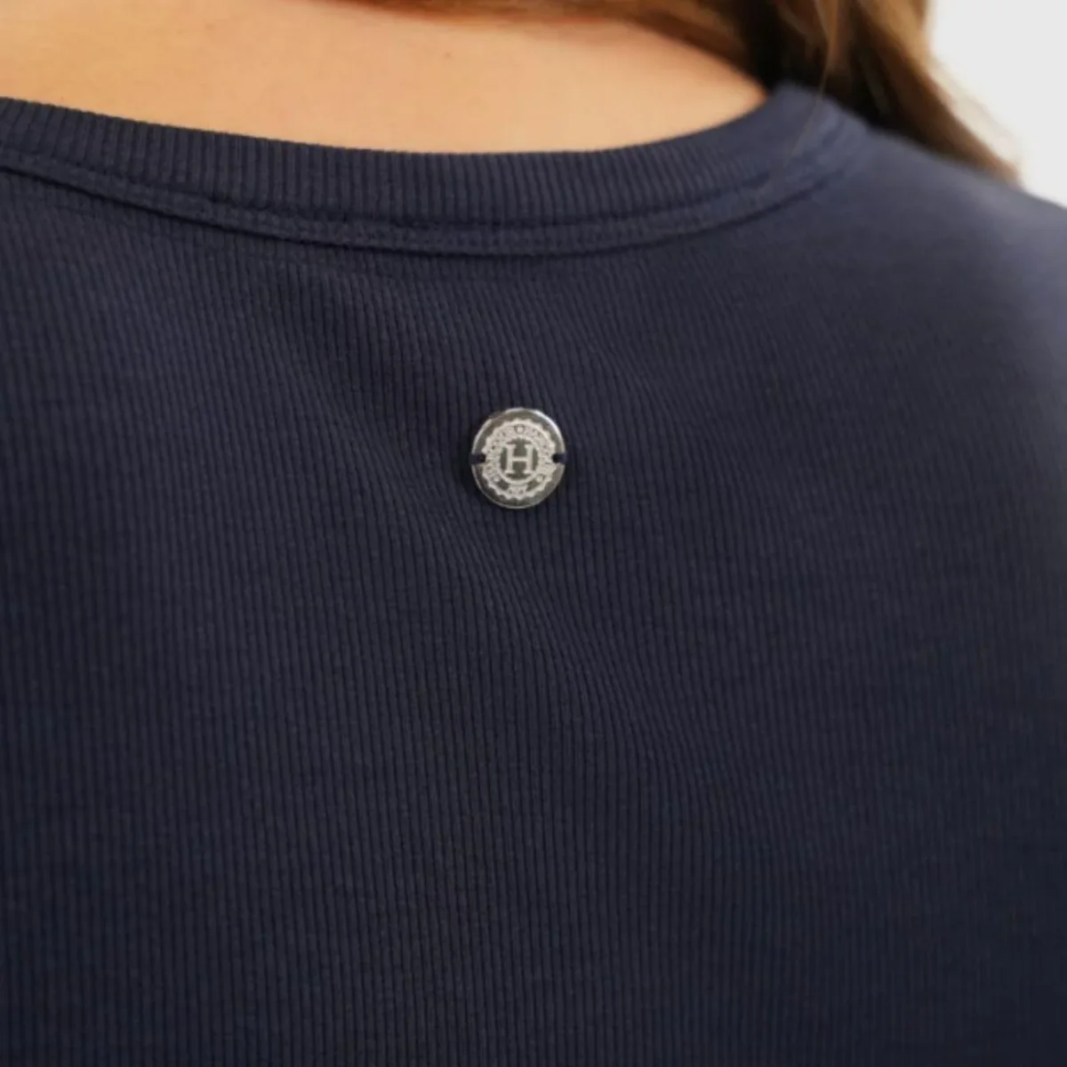 T-shirt da donna a coste leggera, comoda da indossare, dal taglio aderente e attillato che esalta la silhouette. Presenta un colletto tondo, un bottone argentato Harcour sulla nuca e il logo Harcour ricamato sul petto lato cuore.
