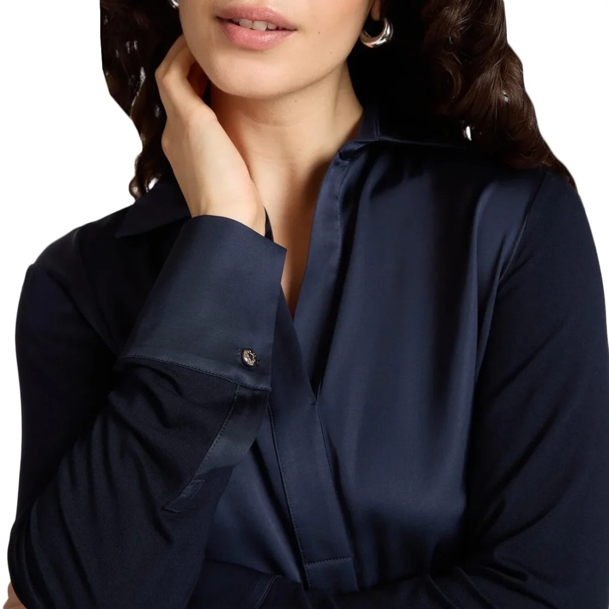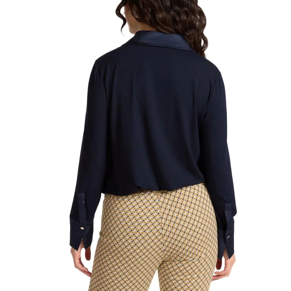 Questa t-shirt unisce l’eleganza del raso lucente sul davanti alla praticità del jersey su maniche e retro, garantendo una linea fluida e confortevole. Il design è rifinito da un colletto classico con apertura a polo e polsini con bottone, dettagli che richiamano lo stile di una camicia. La sua struttura versatile la rende il sottogiacca ideale per aggiungere un tocco di luce ai look formali durante tutta la stagione. Perfetta se abbinata a pantaloni sartoriali per l’ufficio o a un denim ricercato per il tempo libero. Un capo essenziale che coniuga femminilità e comfort in ogni occasione.