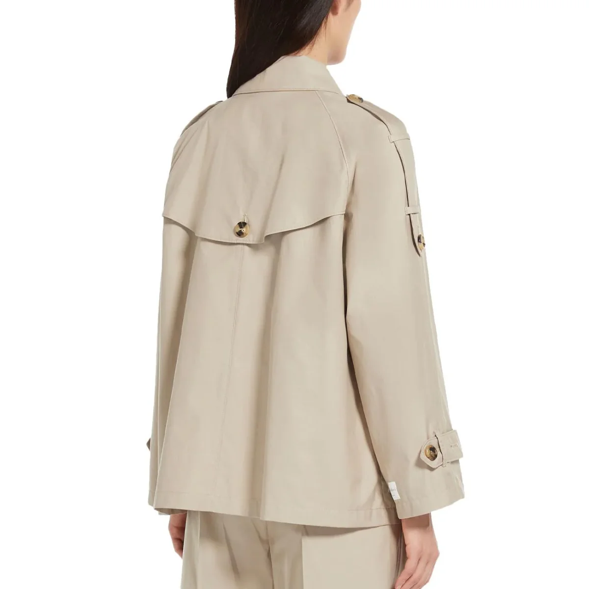 Trench DONNA – Modello: DTRENCH – Colore: RICH BEIGE Trench doppiopetto in twill di misto cotone antigoccia, caratterizzato da colletto a camicia, maniche lunghe raglan con cinturini regolabili sui polsi, alamari sulle spalle e tasche laterali con patta diagonale e bottone. Rifinito con bavolet asimmetrica con bottone sul davanti e mantellina sul retro con bottone. Un modello dalla linea svasata, semifoderato in taffetà e nastro logato jacquard, dotati di chiusura con bottoni in corno. Il tessuto principale di questo capo contiene fibre naturali coltivate in conformità con gli standard dell’agricoltura biologica. COMPOSIZIONE Tessuto 66% cotone, 34% poliestere; fodera 100% poliestere