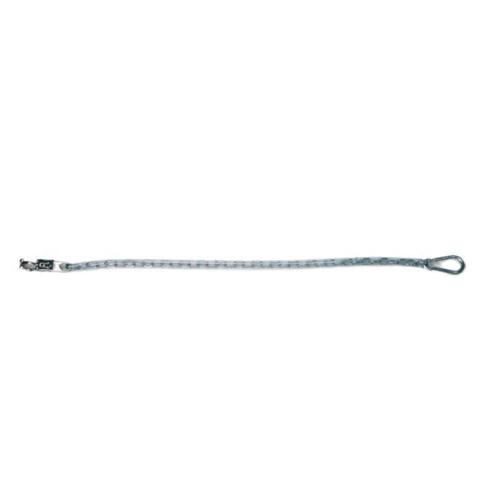 Catena di stazionamento rivestita in PVC trasparente con moschettone a molla e panic snap per un rilascio rapido in emergenza.