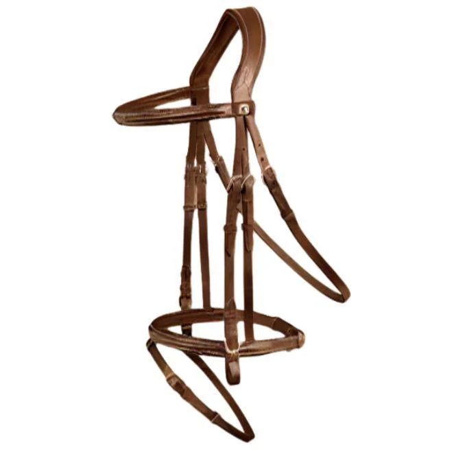 Testiera in cuoio morbido con testiera anatomica e frontalino sagomato; include redini coordinate. Lavorazione curata e imbottiture nei punti di contatto.