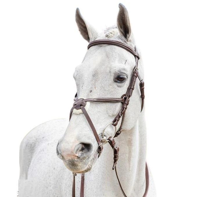 Testiera in cuoio imbottito con finiture curate, pensata per offrire comfort a nuca e capezzina e stabilità del contatto. Redini in gomma incluse nelle varianti specifiche per una presa sicura.