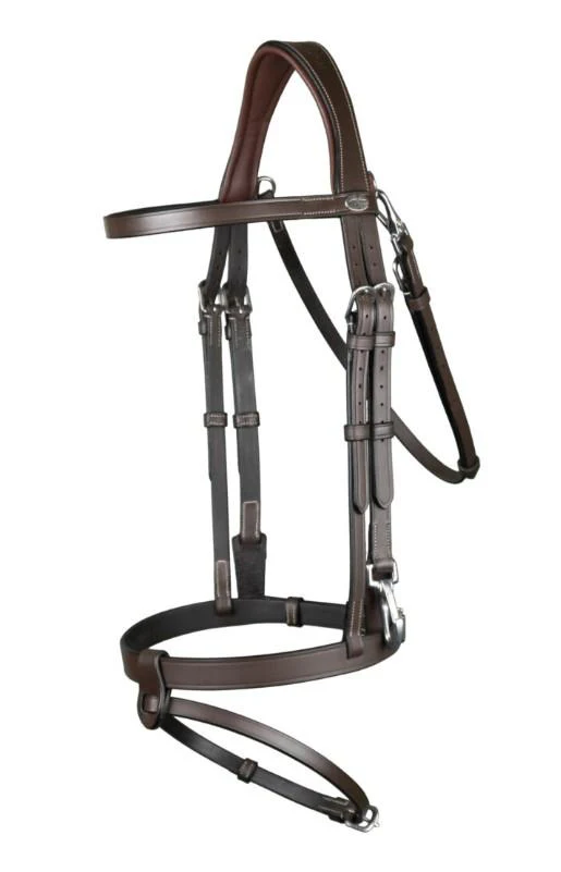 Briglia in cuoio Winner con sopraccapo imbottito e finiture curate e redini con grip in gomma. Le redini rivestite in gomma migliorano la presa senza appesantire la mano, mentre la nasalina sagomata sostiene il contatto in modo stabile e confortevole.