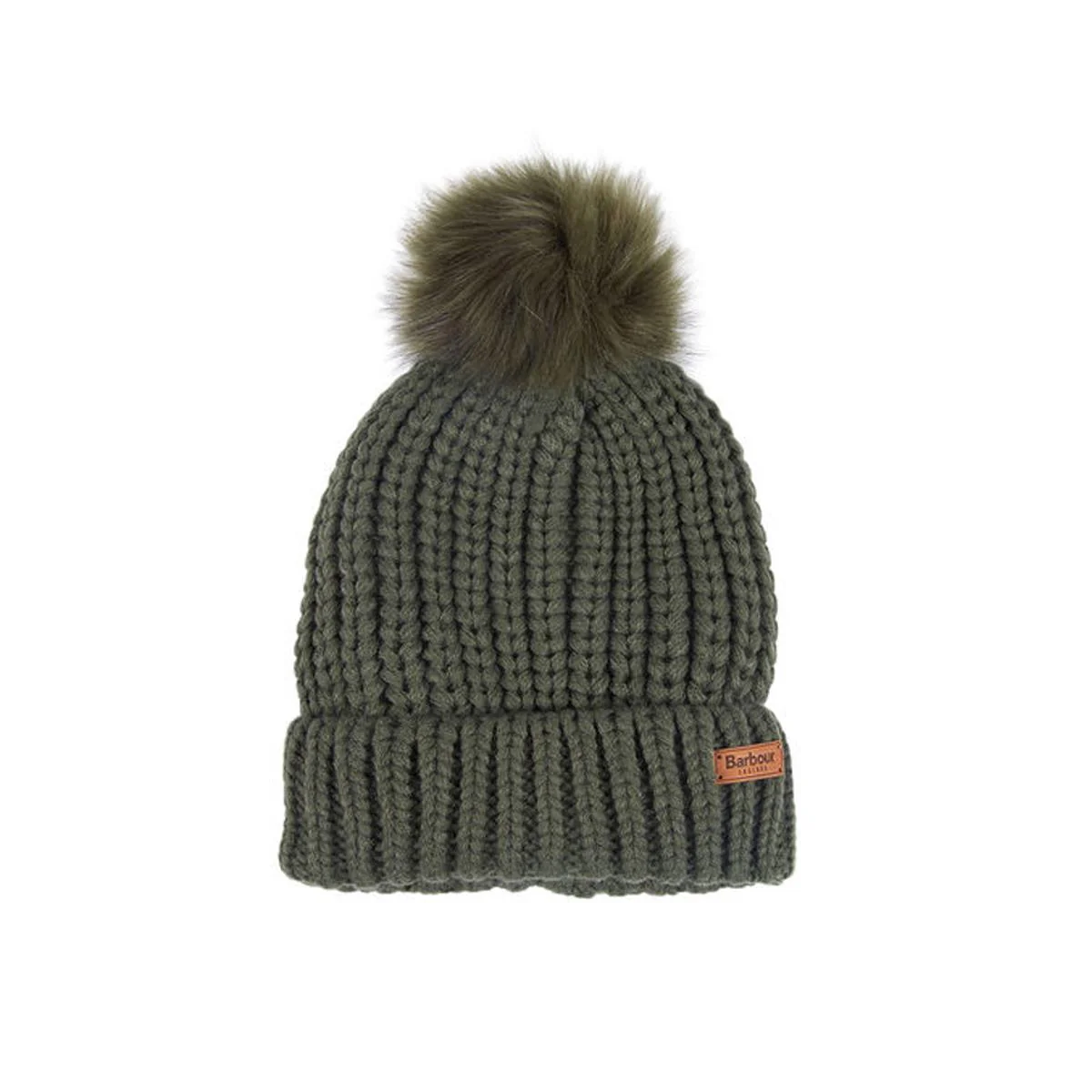 Barbour Berretto Donna Saltburn Maglia Larga A Coste Con Risvolto E Pon Pon Oliva
